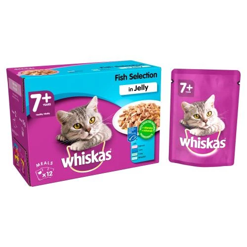 Whiskas 7+ Fish Selection in Jelly has been specially formulated to ensure your cat is full of vitality even in her senior years! This fish selection contains four lip-licking flavours your cat will love, Salmon, Tuna, Coley and Whitefish!