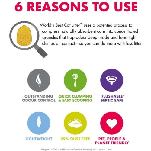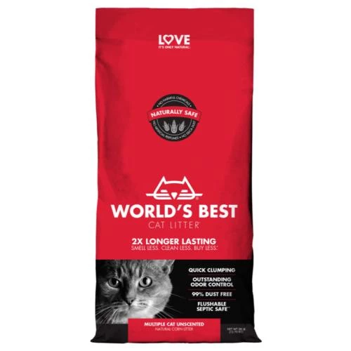 World’s Best is a revolutionary alternative, all natural, organic break-through in scoopable cat litter. Made from whole kernel corn, it’s 99% dust-free and contains no clays, silica dust, synthetic binding or dust reducing agents. Its odour control is second to none and it’s also totally flushable!